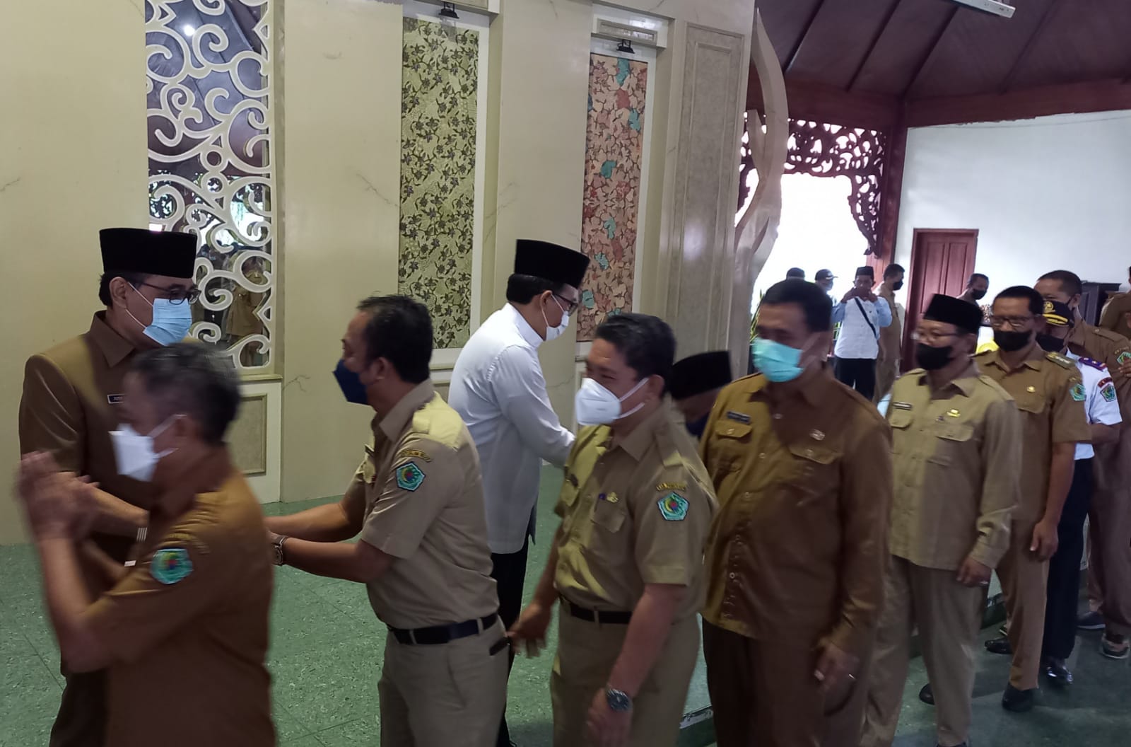 Bupati, Sekdakab dan Pimpinan OPD menyalami para karyawan saat halal bihalal.