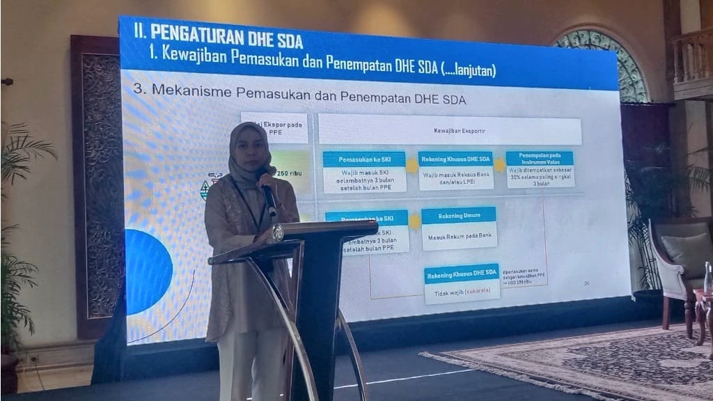 Asisten Manager Departemen Pengelolaan Kepatuhan dan Laporan (DPKL) BI Mahardynastika Nindyah Hapsari menjelaskan implementasi PP Nomor 36 Tahun 2023 tentang Devisa Hasil Ekspor dari Kegiatan Pengusahaan, Pengelolaan dan/atau Pengolahan Sumber Daya Alam (PP DHE SDA) untuk membawa balik DHE SDA ke dalam sistem keuangan Indonesia.
