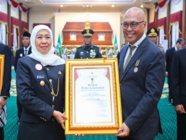 SURABAYA (Global-Newa.co.id) – Ketua Umum Persatuan Wartawan Indonesia (PWI) Pusat, Akhmad Munir atau biasa dipanggil Cak Munir, menerima Lencana Kehormatan Provinsi Jawa Timur Jer Basuki Mawa Beya dari Gubernur Jawa Timur Khofifah Indar Parawansa, pada puncak peringatan Hari Jadi ke-80 Provinsi Jawa Timur, yang digelar di Gedung Negara Grahadi, Surabaya, Minggu (12/10/2025).