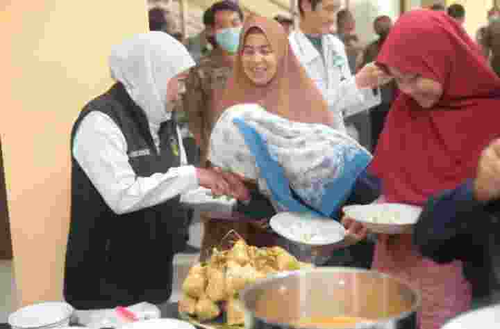 Gubernur Jatim Khofifah Indar Parawansa (kiri) menyuguhi hidangan ketupat, lepet dan opor pada penyintas Sudan asal Jatim saat transit di Asrama Haji Sukolilo Surabaya, Minggu (30/4/2024). (foto Antara)