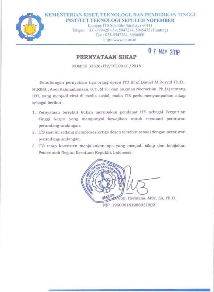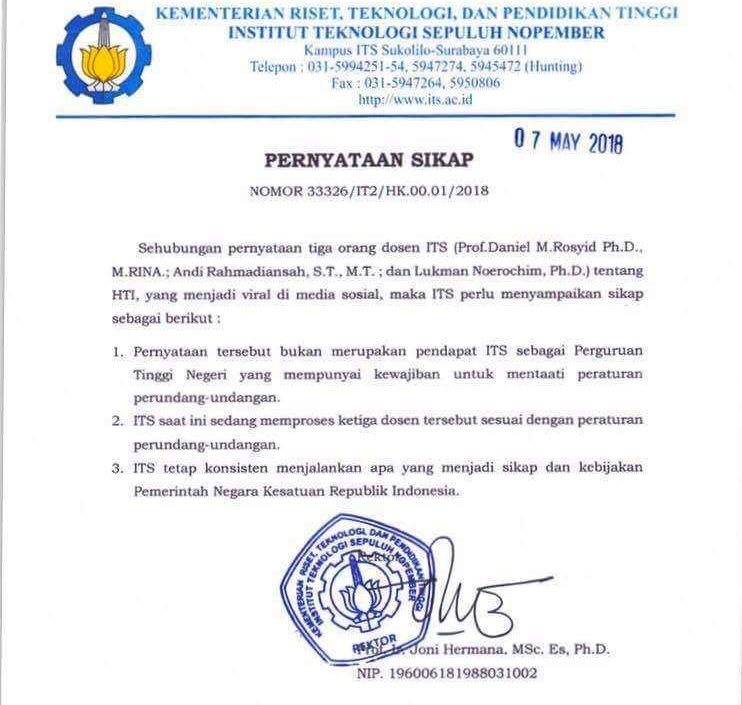 ITS: Kutipan Pernyataan Tiga Dosen terkait HTI Merupakan Sikap Pribadi