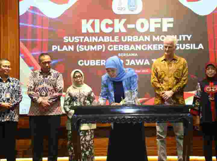 SURABAYA (global-news.co.id) – Pemerintah Provinsi Jawa Timur terus berupa mewujudkan konektivitas di kawasan Gerbangkertosusila Plus (Gresik-Bangkalan-Mojokerto-Sidoarjo-Surabaya-Lamongan-Jombang-Bojonegoro-Tuban). Untuk itu, Gubernur Jawa Timur Khofifah Indar Parawansa bersama Bupati/Walikota Gerbangkertasusila plus dengan pemerintah Jerman melalui Kreditanstalt für Wiederaufbau (KfW) melakukan penandatanganan kesepakatan bersama dalam program Sustainable Urban Mobility Plan (SUMP), di Gedung Negara Grahadi, Surabaya, Selasa (15/11/2022).