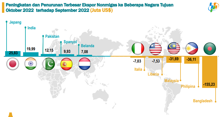 Melansir laman resmi BPS Jatim pada tanggal 23 November 2022, Kepala BPS Jatim, Dadang Hardiwan menerangkan, negara tujuan yang mengalami peningkatan terbesar adalah Jepang sebesar 25,83 juta dollar AS.