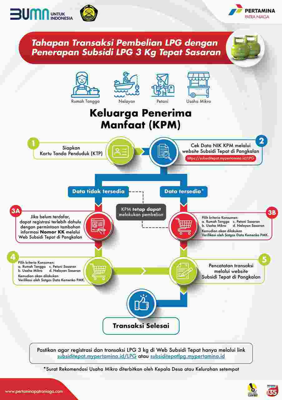 Berdasarkan Keputusan Menteri ESDM No. 37.K/MG.01/MEM.M/2023 tanggal 27 Februari 2023 dalam rangka subsidi LPG tepat sasaran, pembelian LPG oleh individu yang termasuk kelompok konsumen penerima subsidi LPG dilakukan di Pangkalan Resmi Pertamina. “Saat ini berdasarkan aturan terbaru, LPG 3kg Subsidi hanya boleh dikonsumsi oleh Rumah Tangga Prasejahtera, UMKM, Nelayan Sasaran dan Petani Sasaran,” lanjut Ahad.