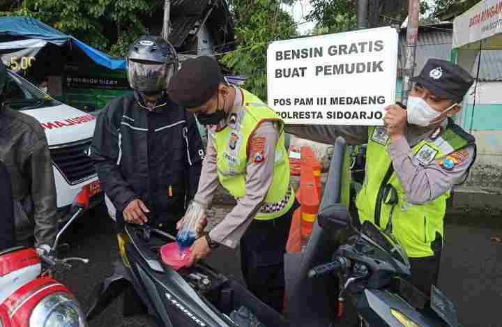 Peduli membantu pemudik Lebaran Idul Fitri, agar lancar dan nyaman di perjalanan, polisi Sidoarjo berikan fasilitas BBM gratis kepada puluhan pemudik pengendara roda dua yang akan menuju ke luar kota.
