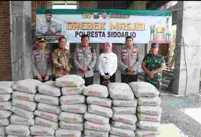 Bantuan bahan bangunan yang diserahkan Kapolresta Sidoarjo Kombes Pol. Kusumo Wahyu Bintoro ke Takmir Masjid Al Mujadid, Keret, Krembung yang sedang tahap pembangunan, berupa 50 sak semen dan pasir satu truk.