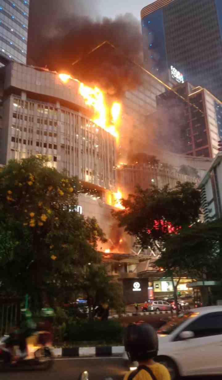 Beberapa video dan foto yang beredar memperlihatkan pengendara berhenti dan mengambil gambar kobaran api yang berada di lantai atas tersebut.